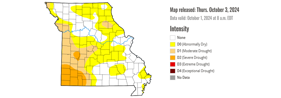 For the local counties, the October 3rd Missouri Drought Monitor shows no drought in Livingston, Carroll, Chariton, and Daviess Counties.   All or portions of Caldwell, Grundy, Linn, and Sullivan Counties are reporting abnormally dry conditions.