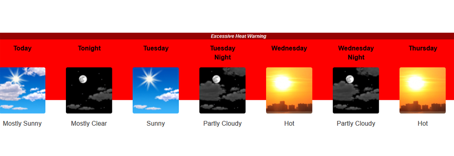 An Excessive Heat Warning is issued for all of the KCHI listening area through Thursday, as temperatures will be in the mid to upper 90’s, and Heat Index values could be as high as 120 degrees.