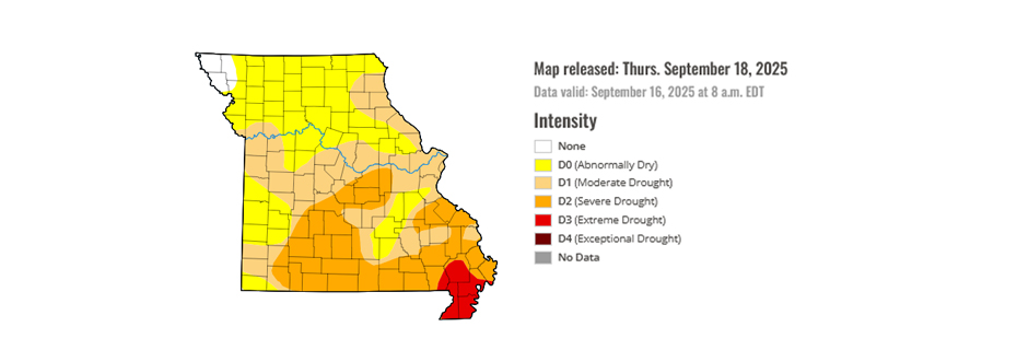 Currently, the U.S. Drought Monitor indicates that all or portions of 85 Missouri counties and the City of St. Louis are experiencing moderate, severe, or extreme drought conditions. Most of these counties are located south of the Missouri River.