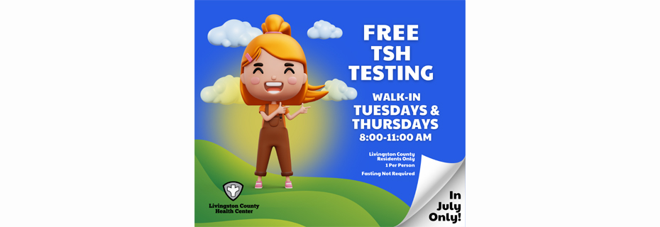 Free testing for Thyroid Stimulating Hormone will be available to Livingston County residents through the month of July.  The Livingston County Health Center is offering the TSH testing Tuesdays and Thursdays from 8:00 to 11:00 am on a walk-in basis.  Ann Burchette from the Health Center says the test results can help identify problems.