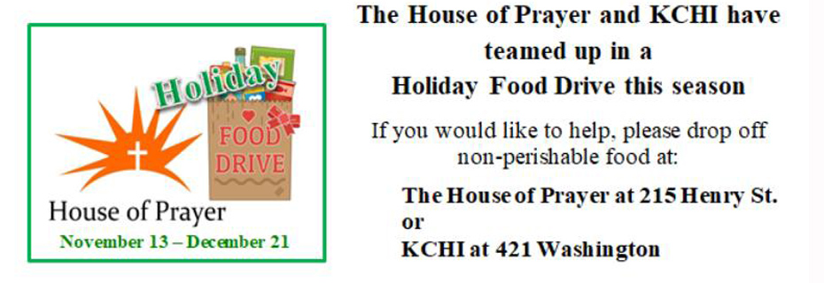 KCHI is teamed up with House of Prayer and Helping Hands for a Holiday Food Drive.  Donations of non-perishable food items may also be dropped at House of Prayer and Helping Hands or there is a drop box in the enrty at KCHI.