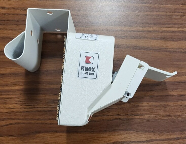 Hangs on the door with a key locked inside, allowing first responders access to the home.