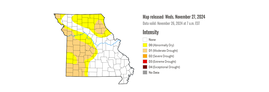 The US Drought Monitor for Missouri shows nearly half of the state has NO DROUGHT. With the remainder of the state Abnormally dry or moderate drought.