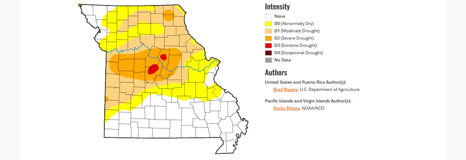 Abnormally dry and moderate drought conditions are in place for the KCHI listing area.  While much of southern Missouri and the far northwest corner are showing normal moisture levels, much of the state is below normal.
