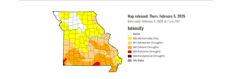 Moderate and severe drought conditions continue across southern Missouri. The Missouri Drought Monitor released February 3rd shows little change from the previous period, with pockets of extreme drought along the Arkansas border.