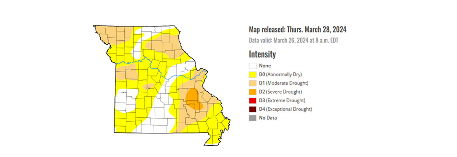 While nearly three-quarters of Missouri is listed as at least Abnormally Dry, conditions locally are a bit mixed, with most of the local counties Abnormally dry, much of Livingston, Sullivan, and Carroll Counties are showing no drought, and a small portion of Linn County is showing D1 – Moderate Drought.