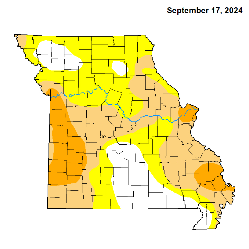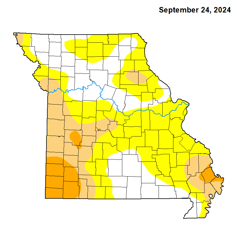 While Southwest Missouri and a portion of Southeast Missouri are experiencing moderate and severe drought conditions, as of September 24th, the Missouri Drought Monitor shows most of North Missouri has no drought or abnormally dry conditions.