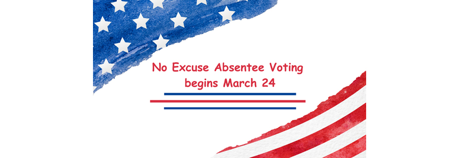 No excuse absentee voting for the April 7th Municipal Election will begin on Tuesday, March 24th.  Anyone choosing to vote absentee in the Municipal Election who does not have an allowable excuse may do so beginning on March 24th through 5:00 pm on April 6th.