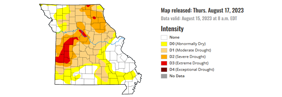 5.13% of the state of Missouri is listed in Extreme Drought. That is down from 8.77% last week.