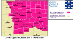 A Red Flag Warning is issued for northern and central Missouri. The red Flag Warning is issued from Noon today to 6:00 pm, for extreme fire danger due to dry and windy conditions.  The National Weather Service says any fire that develops will catch and spread quickly. Outdoor burning is not recommended.