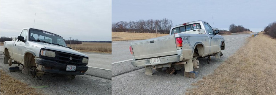 Tires and wheels were stolen from a vehicle that had broken down Saturday near the Chula Junction on US 65. The vehicle was fine on Sunday when the owner checked it, but on Monday, the owner found someone had removed all four tires and wheels from the truck.