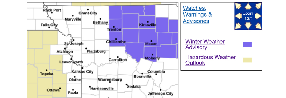 A Winter Weather Advisory is issued for Wednesday morning due to the freezing rain expected over portions of the KCHI listening area. The Advisory covers north-central and northeast Missouri, including Livingston, Grundy, Sullivan, Linn, and Chariton Counties in the local area.