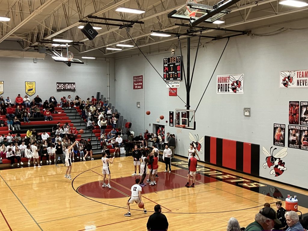 The air came out of the gym however early in the 3rd quarter when Sol’jier Allen suffered a knee injury and had to be helped off the court. St. Pius capitalized by tying the game up, but the Hornets did not waiver, with the game tied, Jackson Trout converted two free throws to retake the lead and the Hornets remained ahead the rest of the way. Later in the quarter, in Allen’s absence, Kenyen Gannan knocked in a big three pointer and Chillicothe took a six point lead into the 4th.